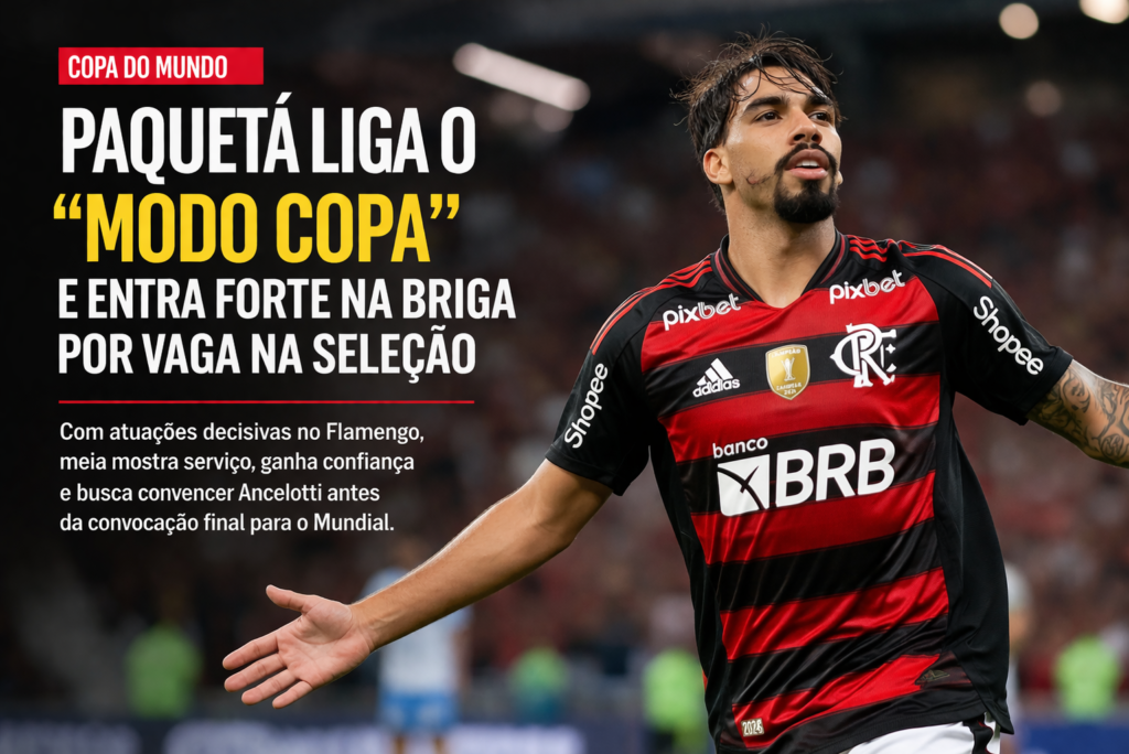 Em reta decisiva antes da convocação final para a Copa do Mundo, Lucas Paquetá vive um momento de afirmação no Flamengo e reforça sua candidatura a uma vaga entre os 26 nomes da Seleção Brasileira. Mesmo começando no banco contra o Santos, no último domingo, o meia foi decisivo: entrou no segundo tempo, ajudou a mudar o ritmo da equipe e marcou o terceiro gol na vitória por 3 a 1, no Maracanã.